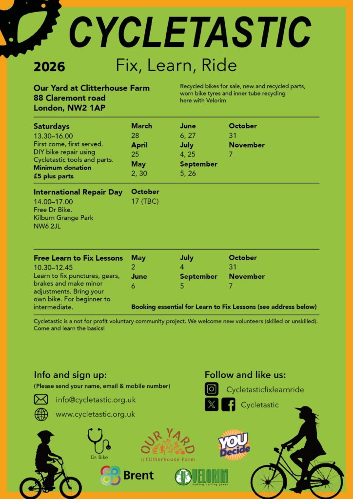 The Cycletastic Community bike shed was established in 2010 with a London Cycle Campaign community bike fund.Ā Cycletastic is aĀ volunteer led, bike repair project . The Project was originally set up in Kilburn alongside a Healthy neighbourhoods transformationĀ to the Brent Eleven Streets area .Ā Cycletastic volunteers recycle pre lovedĀ bikes back to the community and offer basic bike repair whilst you get hands on and learn how to.Ā Cycletastic also offerĀ bike riding training for all ages when funding allows .